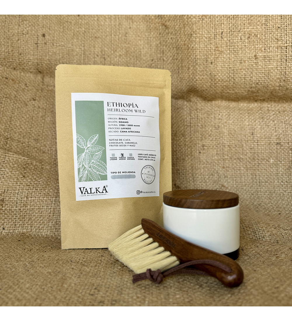 Café Ethiopía 250 gr. EN GRANO + Contenedor cerámico 150 ml + CEPILLO DE REGALO
